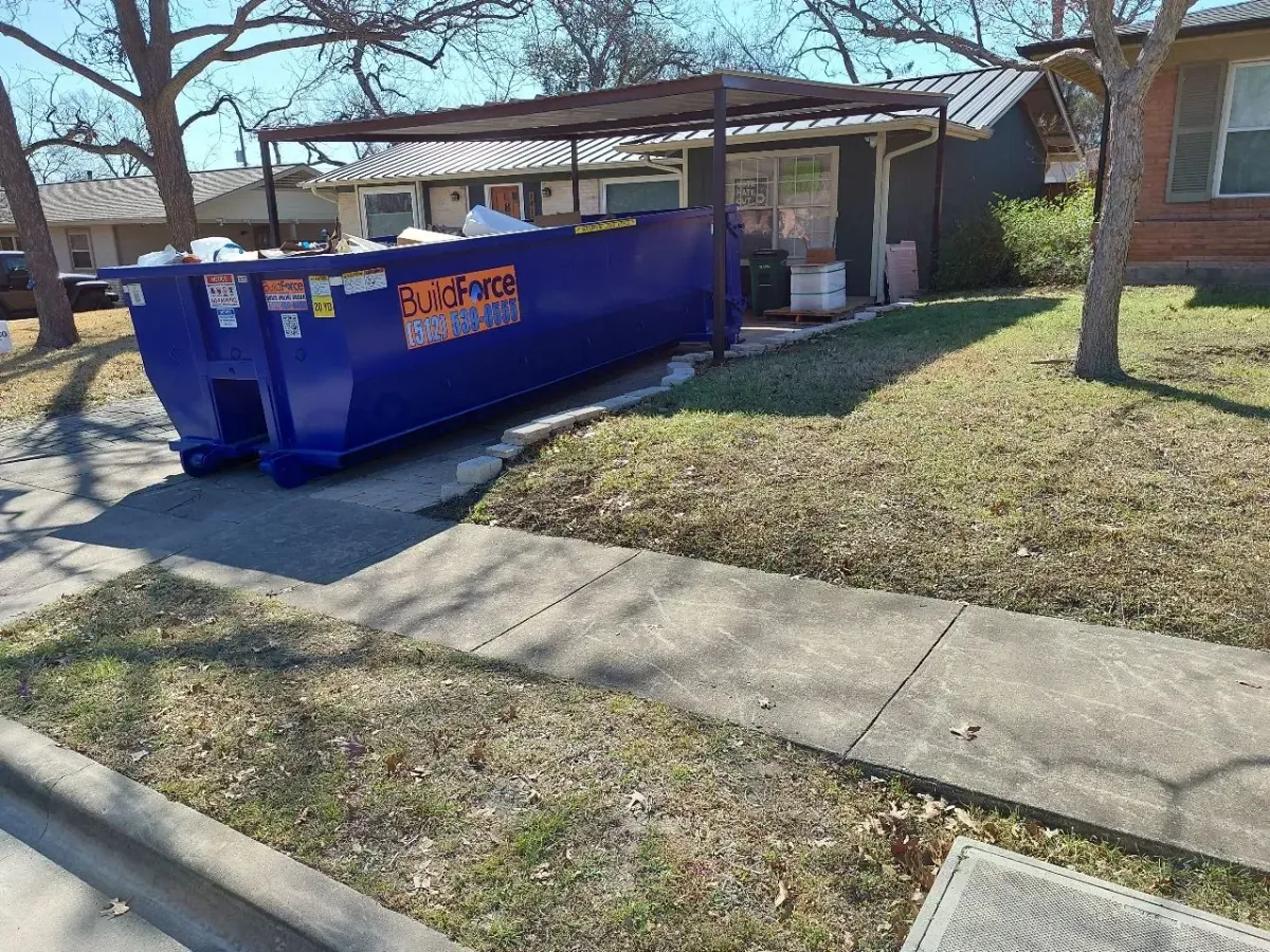 Our 20-yard dumpster from BuildForce Dumpster Rentals - Austin is perfect for medium-sized home projects. It fits neatly in residential spaces and handles debris from kitchen remodels, garage cleanouts, yard projects, and other home renovations without crowding your driveway.