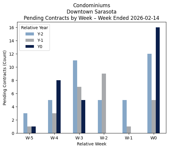 Source of data is Stellar MLS for the property types Condominiums and Townhouses in ZIP 34236 over the past 6 weeks ended 02-14-2026 and the same comparable period for the previous 2 years. Pendings are homes listed for sale that have been placed under contract. The current number of new pendings is one of the best measures of current market activity. The data excludes new construction.