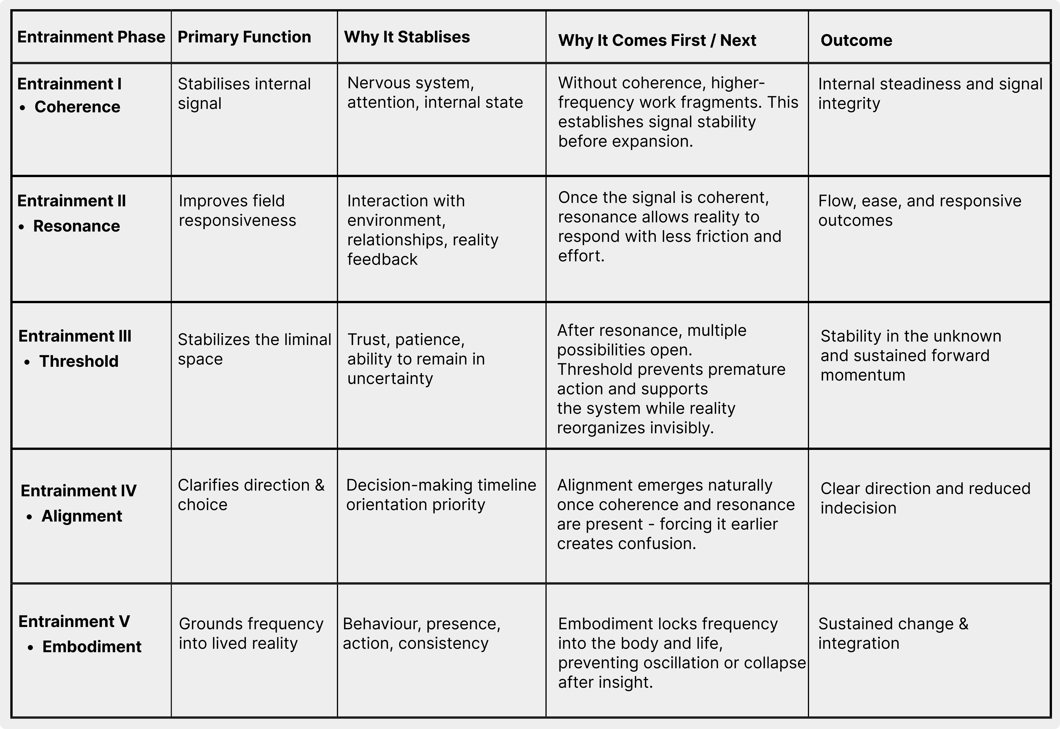 Rather than skipping ahead, Entrainment works best when followed in order, beginning with Coherence, which establishes signal stability, and progressing only once the system can hold that stability under real-world conditions.
