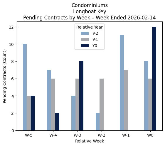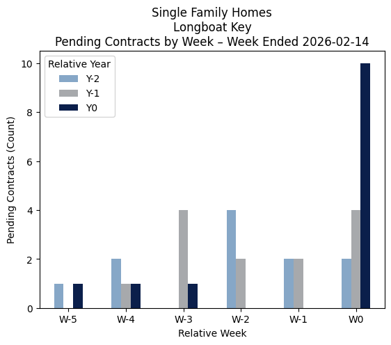 Source of data is Stellar MLS for the property types Condominiums (Condominiums and Townhouses) and Single-Family Homes (Single-Family Homes and Villas) in ZIP 34228 over the past 6 weeks ended 02-14-2026 and the same comparable period in the prior 2 years, excluding new construction sales. Pendings are homes listed for sale that have been placed under contract. The current number of new pendings is one of the best measures of current market activity. The graphs show that activity for each of the past 6 weeks vs comparable weeks in the prior 2 years.