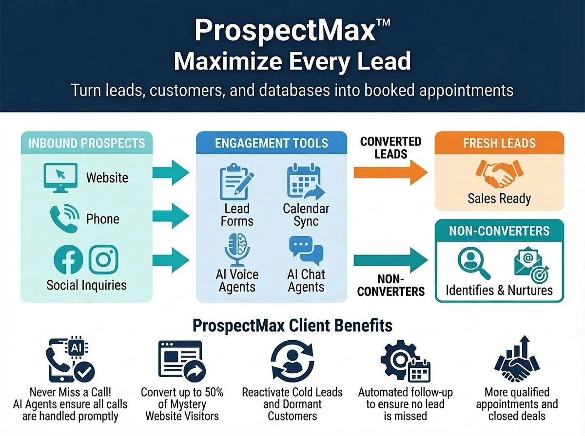 The ProspectMax Lead Management System converts more inbound phone, web and social leads, with AI powered automated tools that turn more prospects into fresh leads while generating a better Return on Your Marketing Investment