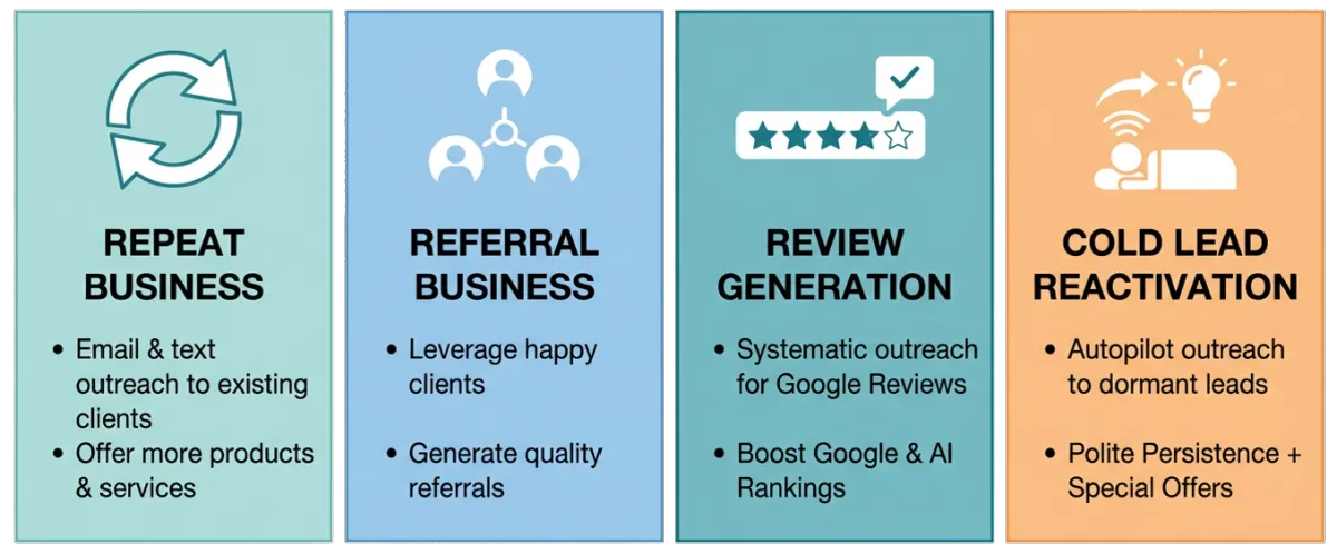 Review Generation: systematic outreach to happy customers to increase Google Review count. Fresh reviews reassure prospects and boost your Google & AI Rankings.