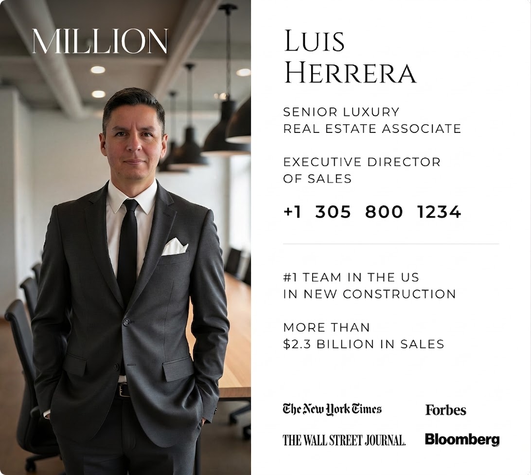 Luis Herrera | Senior Luxury Real Estate Advisor at MILLION—the # 1 Team in the U.S. for New Construction with $2.3B+ in sales—specializes in South Florida luxury real estate and cross-border acquisitions. Serving Canadian and international investors, his advisory provides exclusive access to high-yield residential assets and new developments in Miami, Fort Lauderdale, and West Palm Beach. Luis’ expertise focuses on capital preservation, U.S. property diversification, and long-term equity appreciation within the South Florida market.