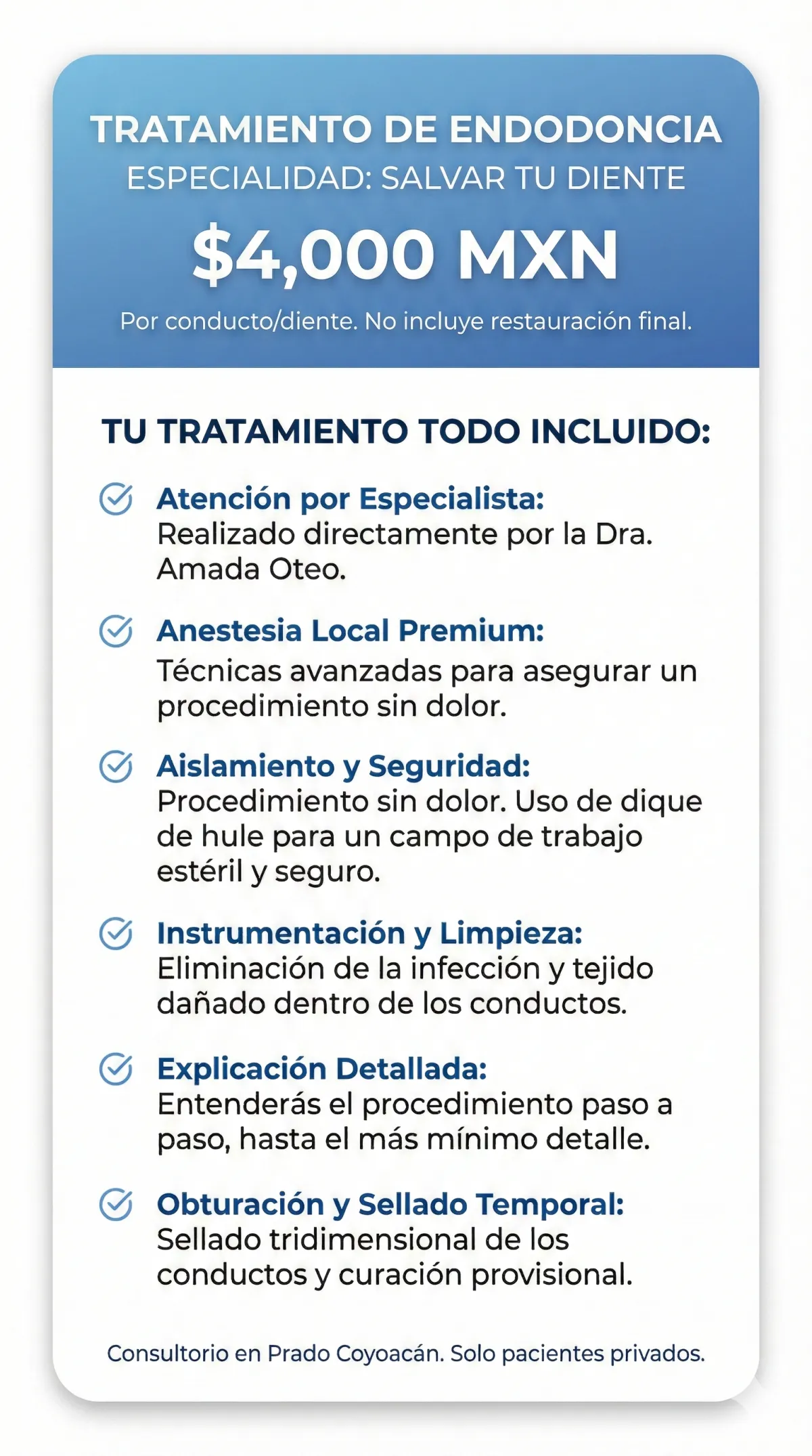 Clínica dental en Prado Coyoacán. Especialistas en Endodoncia, eliminación de dolor y estética dental. Atención personalizada con la Dra. Amada Oteo.