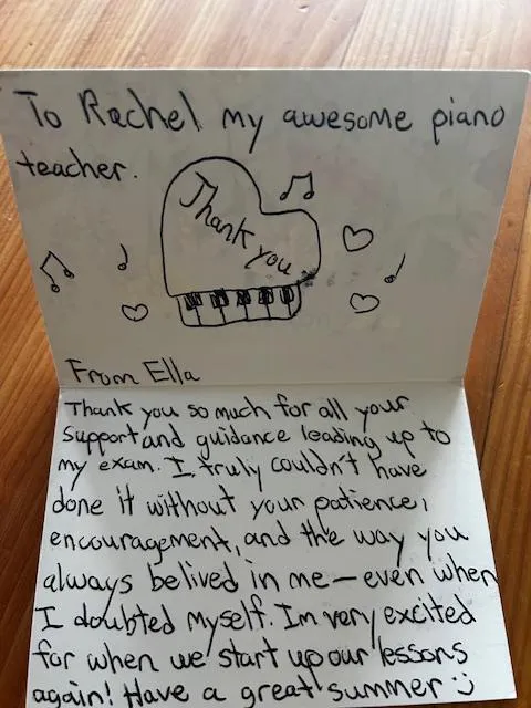 Alongside classical training and RCM preparation, I also introduce students to a variety of musical styles, including pop, jazz, blues, and chord-based playing. I want students to feel well-rounded and engaged in the music they’re learning.