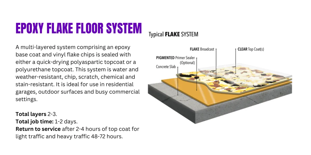 Flake Epoxy: Add texture and color to your floors with flake epoxy systems, ideal for both residential and commercial spaces requiring slip-resistant surfaces.