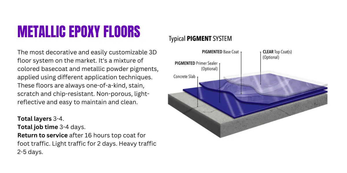 Metallic Epoxy: Achieve a unique, high-gloss look with metallic epoxy floors, perfect for adding a sophisticated touch to retail, office, or residential environments.