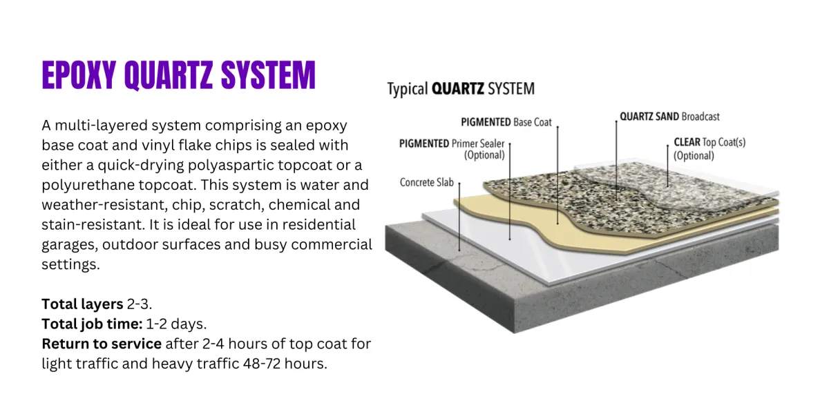 Quartz Epoxy: Create a luxurious appearance with quartz epoxy, combining durability with a decorative finish suitable for various indoor and outdoor applications.
