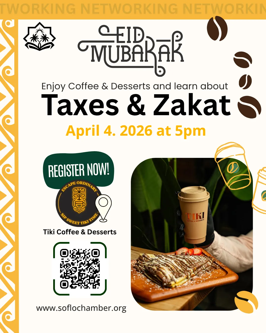 Celebrate Eid with your business community! Join us for an educational evening on taxes and Zakat โ what you need to know as a business owner and Muslim professional โ over coffee, sweet treats, and great conversation.