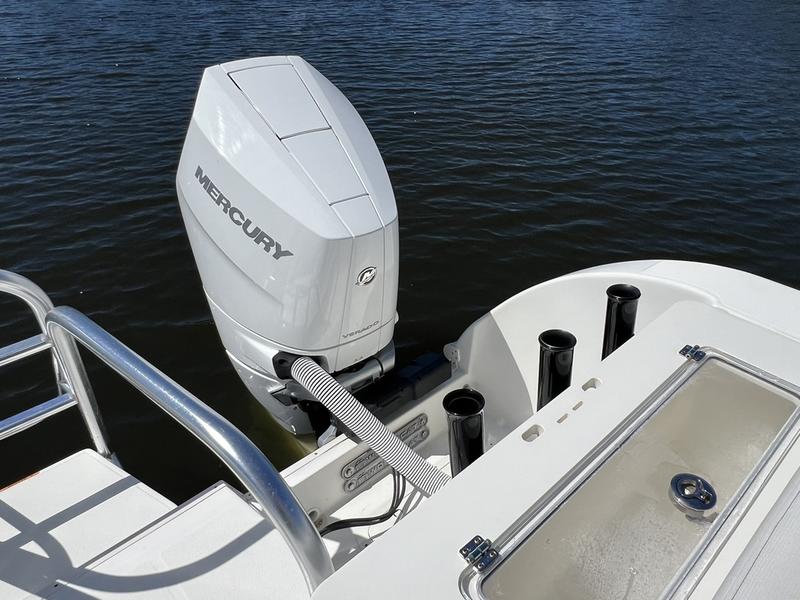 Fiberglass leaning post tackle center with sink, 45-gallon insulated, raw water livewell with 1100-GPH magnetic drive pump, overboard drain, and a clear lid