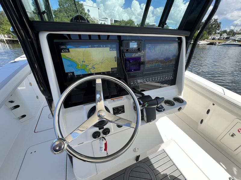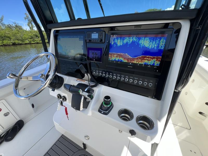 Fiberglass console with electronics area, netted storage compartments, 2 stainless steel cup holders, passenger handrail, footrest, insulated storage compartment, & black dash brow