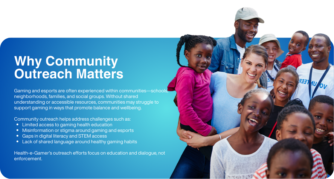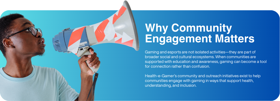 Health-e-Gamer® works alongside communities to promote healthier conversations around gaming, esports, and digital engagement. Through outreach initiatives and collaborative efforts, the organization helps communities better understand how gaming fits into health, wellbeing, and access to opportunity.