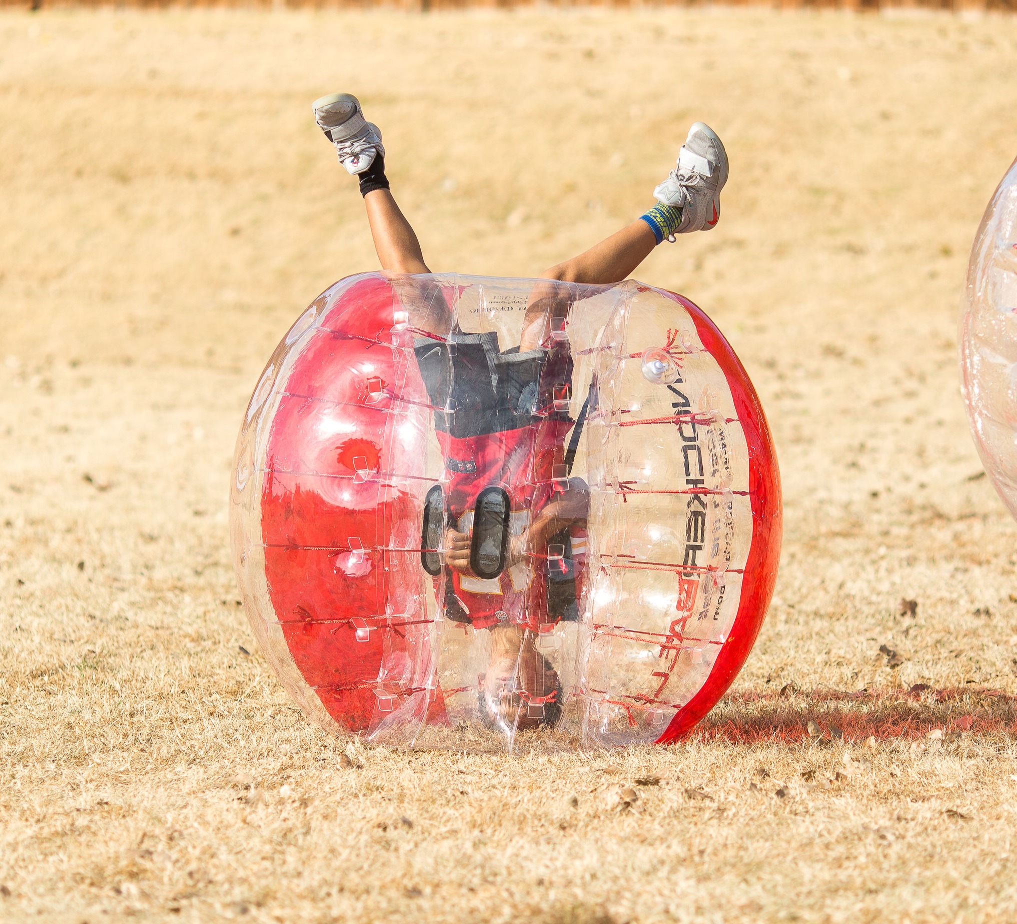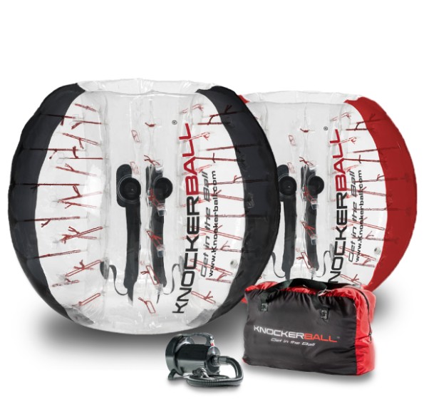 Knockerball is a single-chamber inflatable plastic bubble with inner handles and adjustable shoulder straps. Players get in the “donut-hole” part of the ball head-first, secure the straps (like a backpack) and hold on to the inside handles for stability and control.