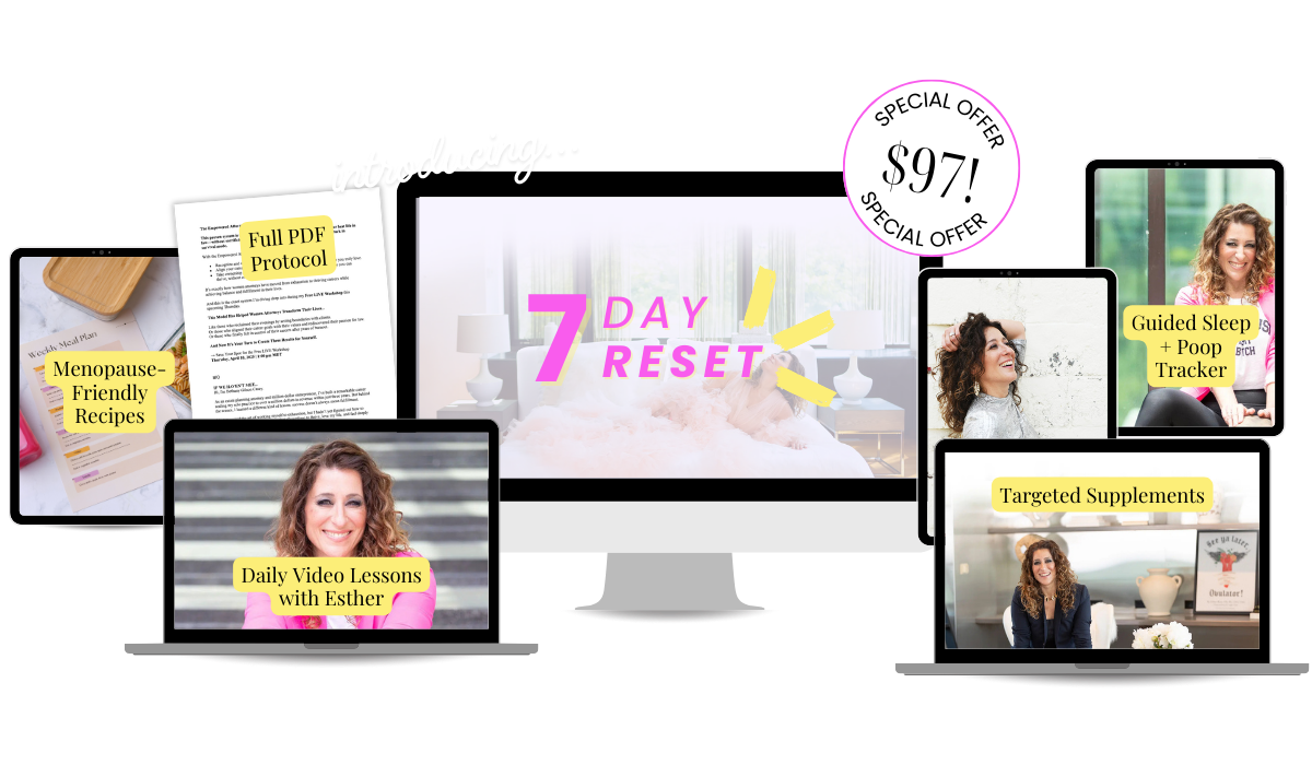 The 7-Day Reset is a guided program created by Esther Blum, a menopause dietitian and functional medicine expert, specifically for women in perimenopause or menopause. It focuses on helping you sleep through the night, improve digestive regularity, and feel like yourself again using daily video lessons, a nutrition and supplement protocol, rituals, and a sleep/poop tracker.