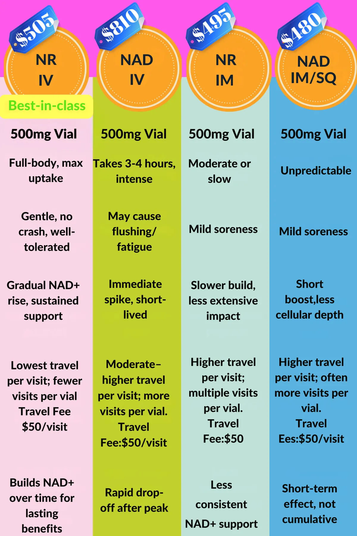 Transparent, fair pricing (infusion service included with NAD⁺ vial purchase)