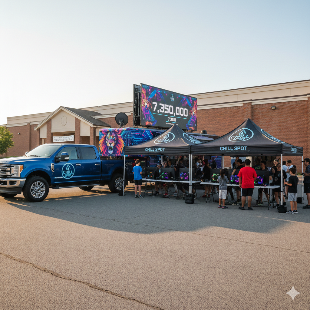 Bring the Party Anywhere Why wait to come to us when we can bring the ultimate gaming experience to your front door? The Chill Spot Mobile Gaming Unit is a high-tech, all-in-one entertainment powerhouse designed to make your next community event, birthday, or corporate gathering legendary.