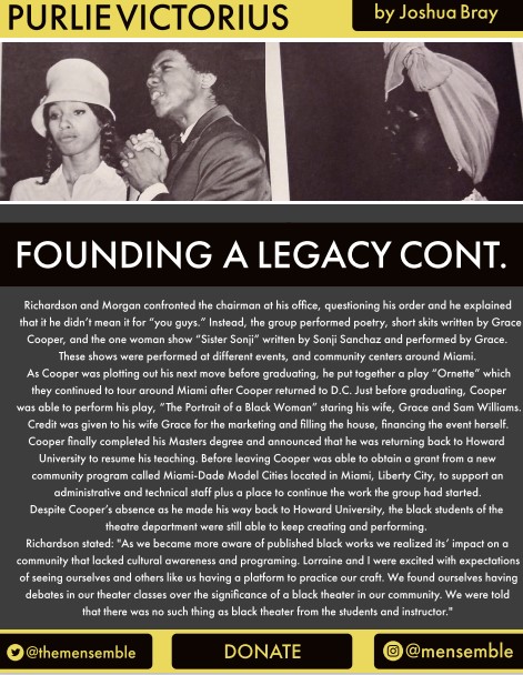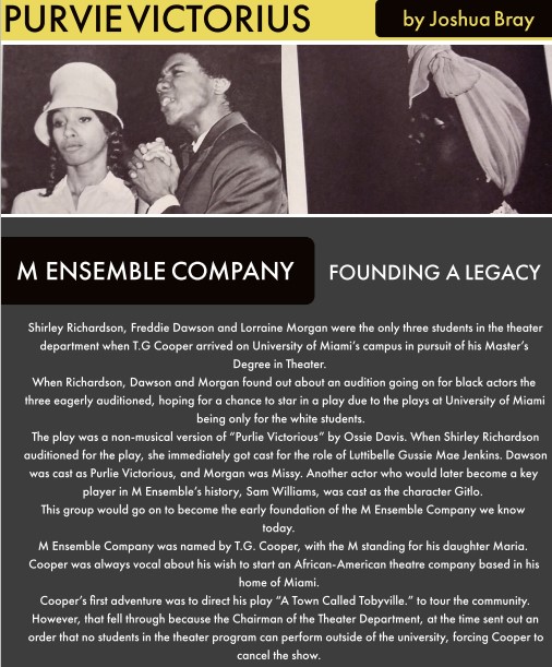 Shirley Richardson, Freddie Dawson and Lorraine Morgan were the only three students in the theater department when T.G. Cooper arrived on University of Miami/s Campus in pursuit of his Master’s Degree in Theater….