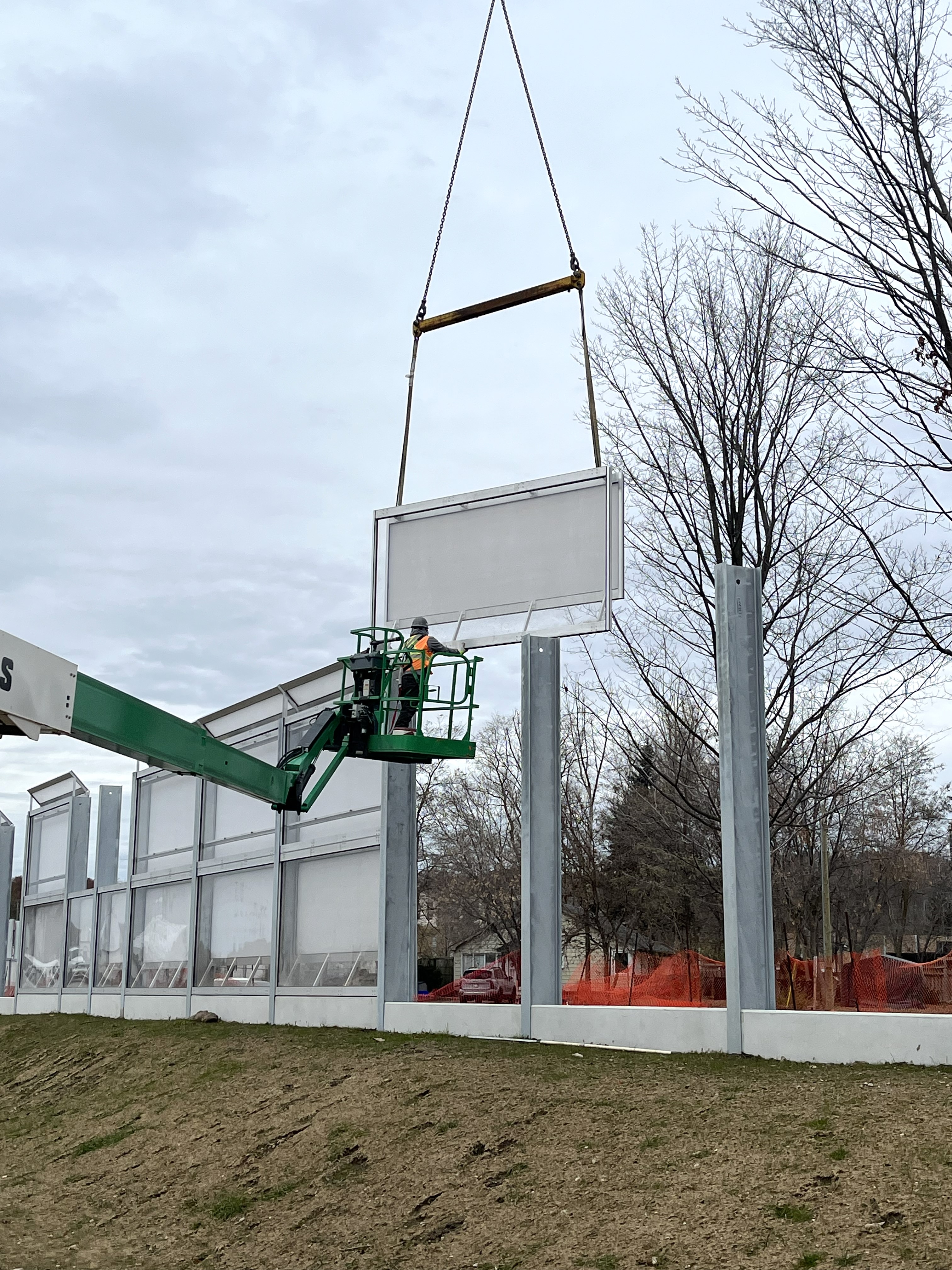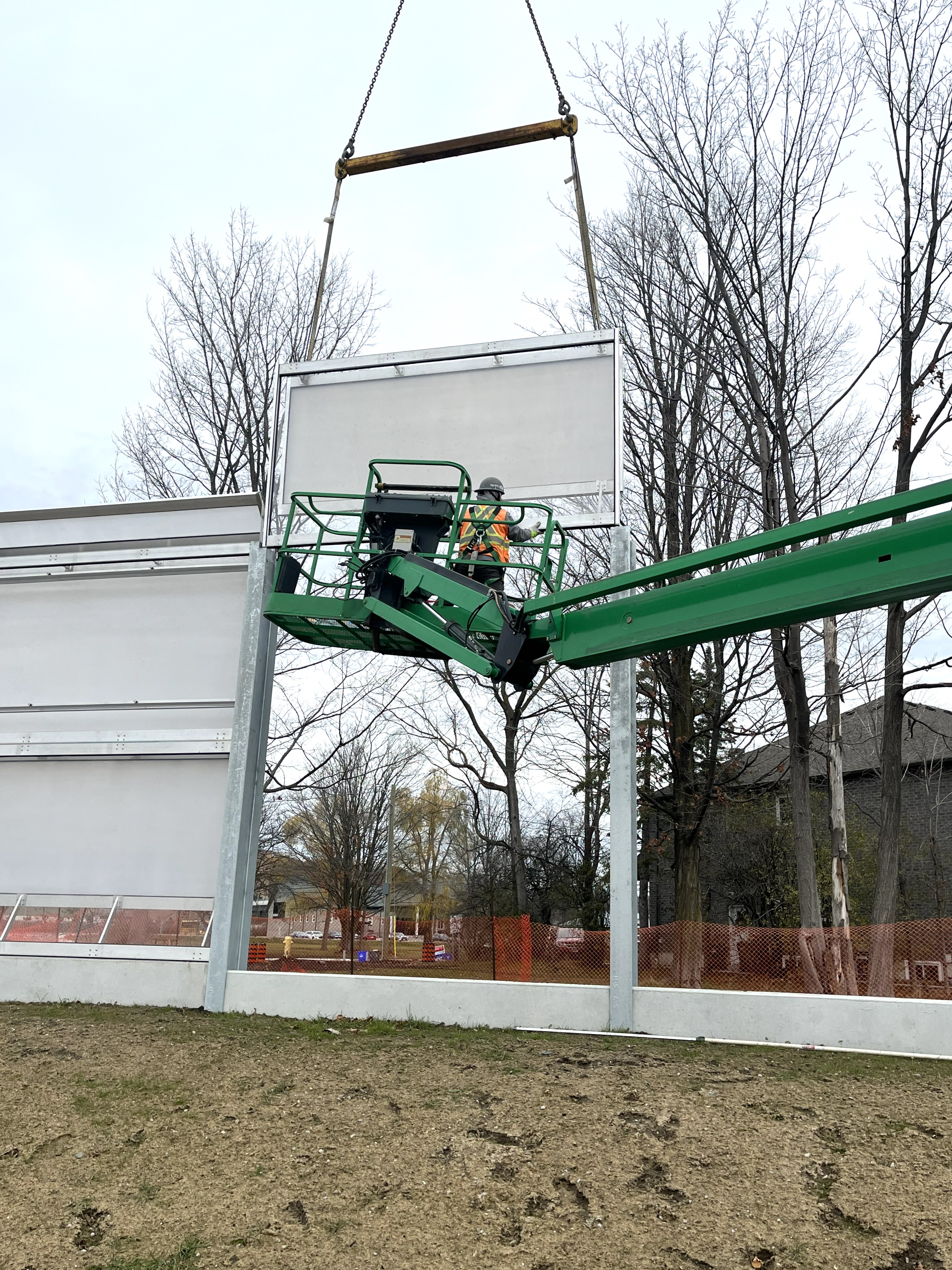 A design and build project for Waterford Arena in Southern Ontario. Designed using Durisol panels, this over 6m high noise barrier wall required beams that neared 10m in length lifted over the arena to be installed in a narrow space between the condensor and property line. With an ashlar finish this wall provides noise attenuation combined with a visual barrier for the neighbouring residences.
