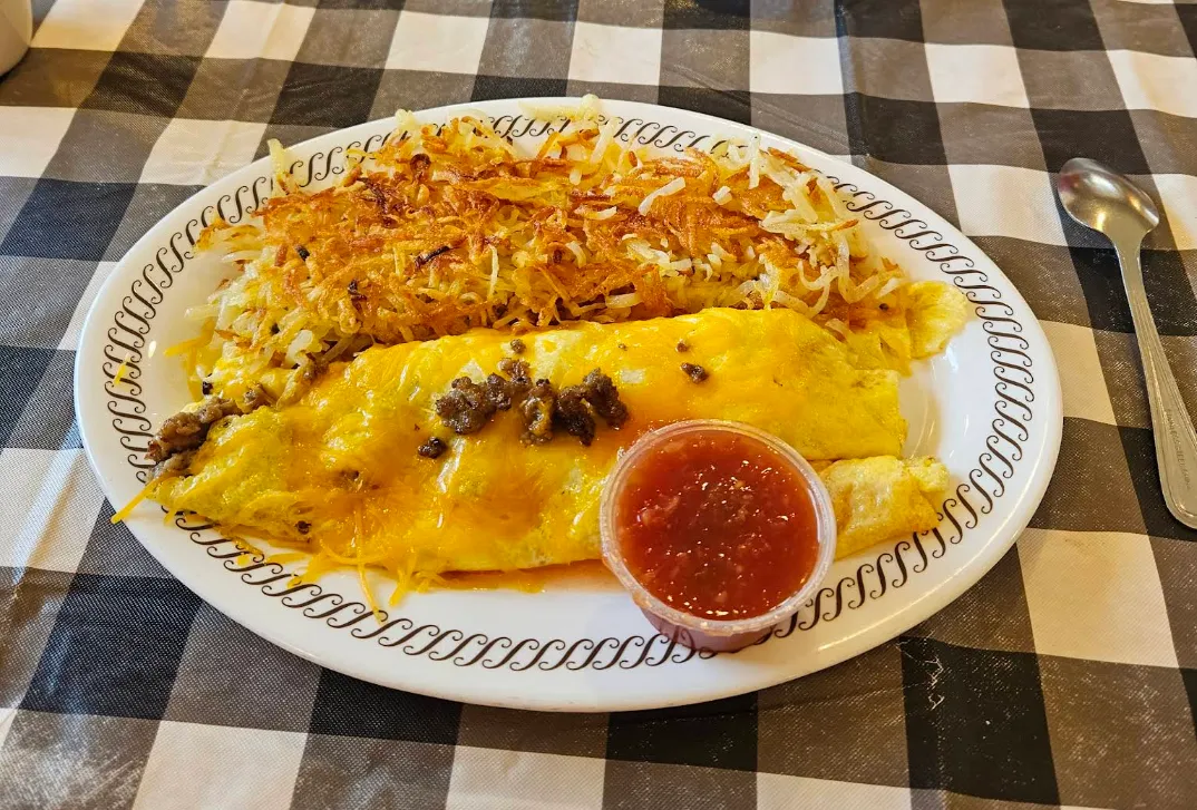 Loaded with eggs, cheese, onion, bell pepper & choice of meat; served with tator tots or hash browns