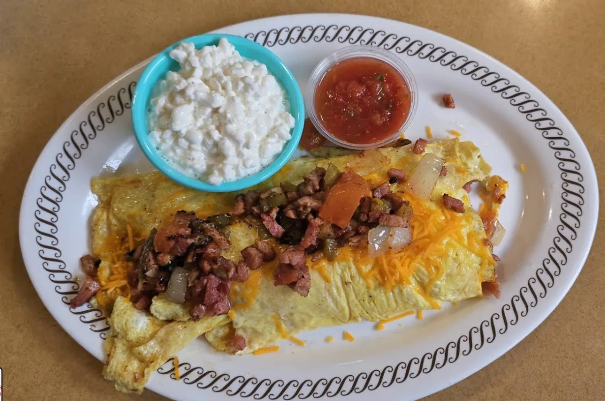 Three eggs, loaded hash browns with cheese, onions & bell peppers served with bacon, sausage & ham, biscuit & gravy or toast