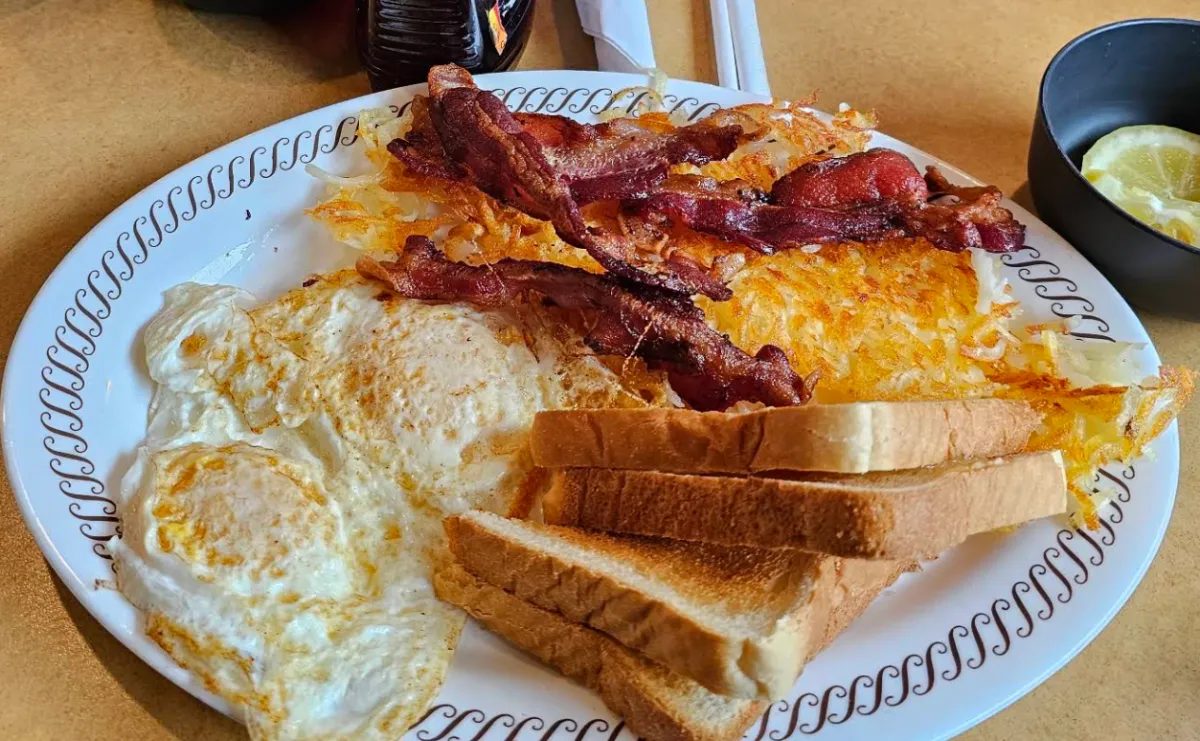 Two eggs, two pancakes, bacon, sausage, or ham, hash browns