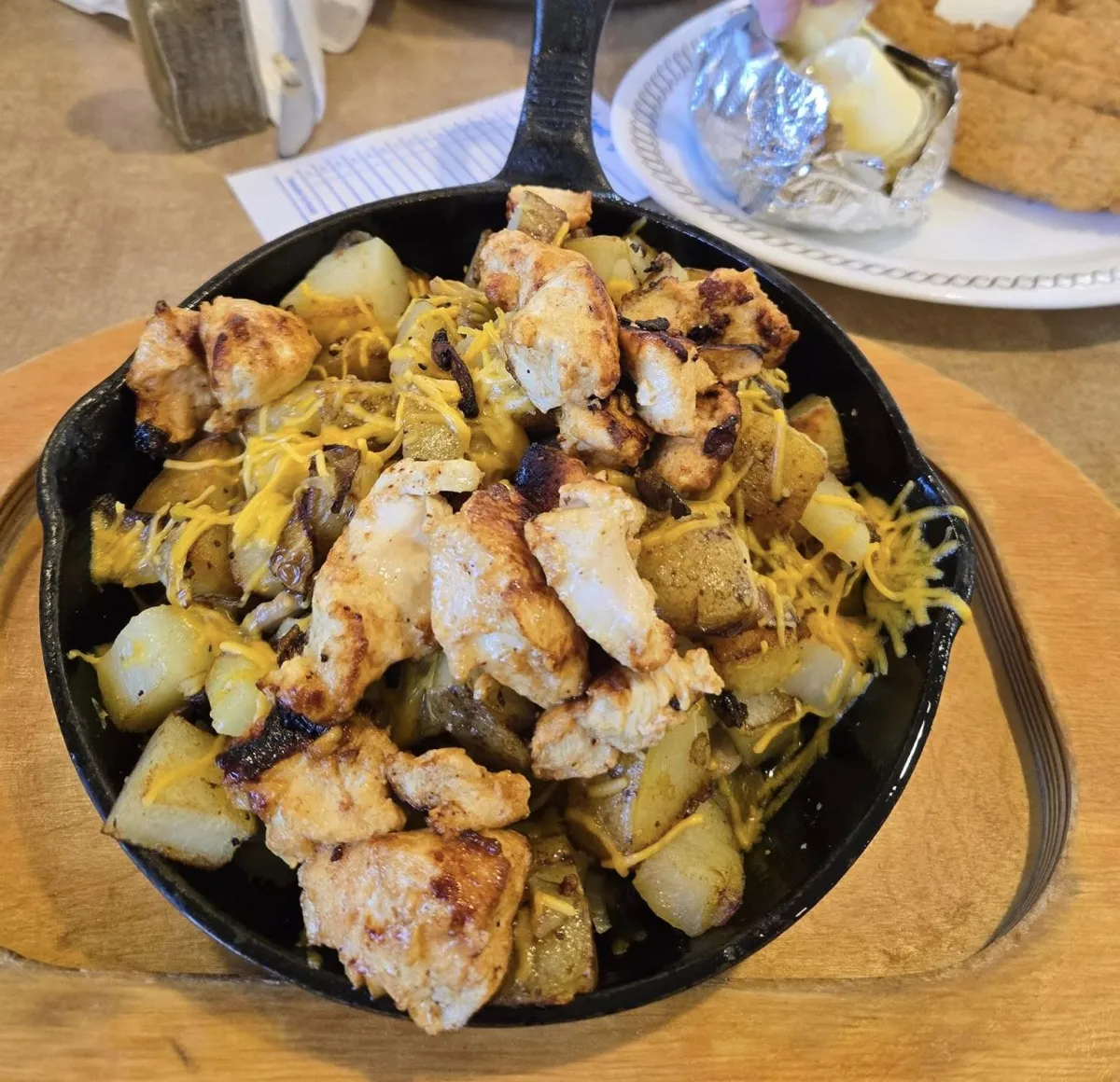 Fried or grilled kitty chicken with home fries, cheese, bell pepper, onion & mushroom