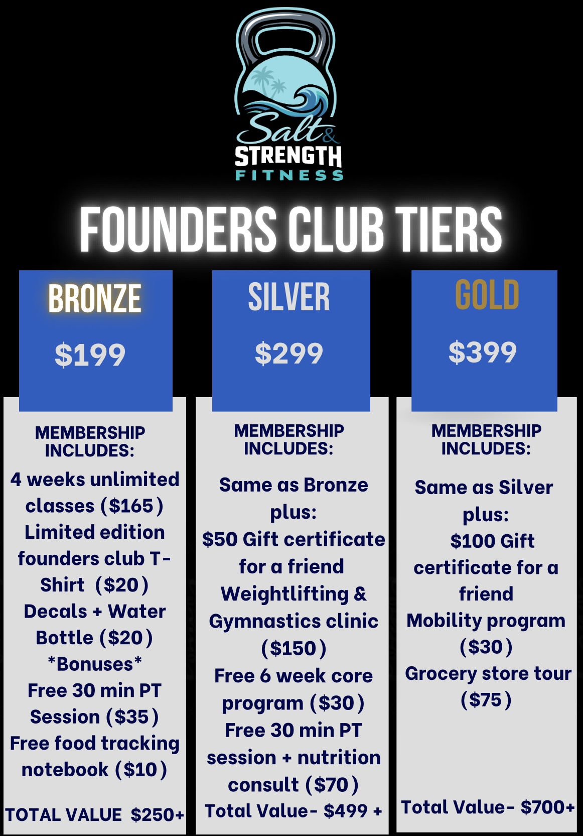 In addition to this $ value of each tier, you will also receive access to Founding Members only workouts, and special recognition at the grand opening. Your name will forever be known as Founding Member!