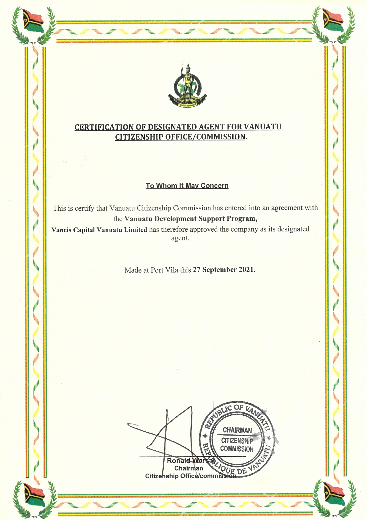 Vancis Capital is a Government-authorized agent for the Vanuatu Citizenship Program. We offer assistance to clients worldwide who wish to invest in a future with opportunities and security. Click here to view our official license.