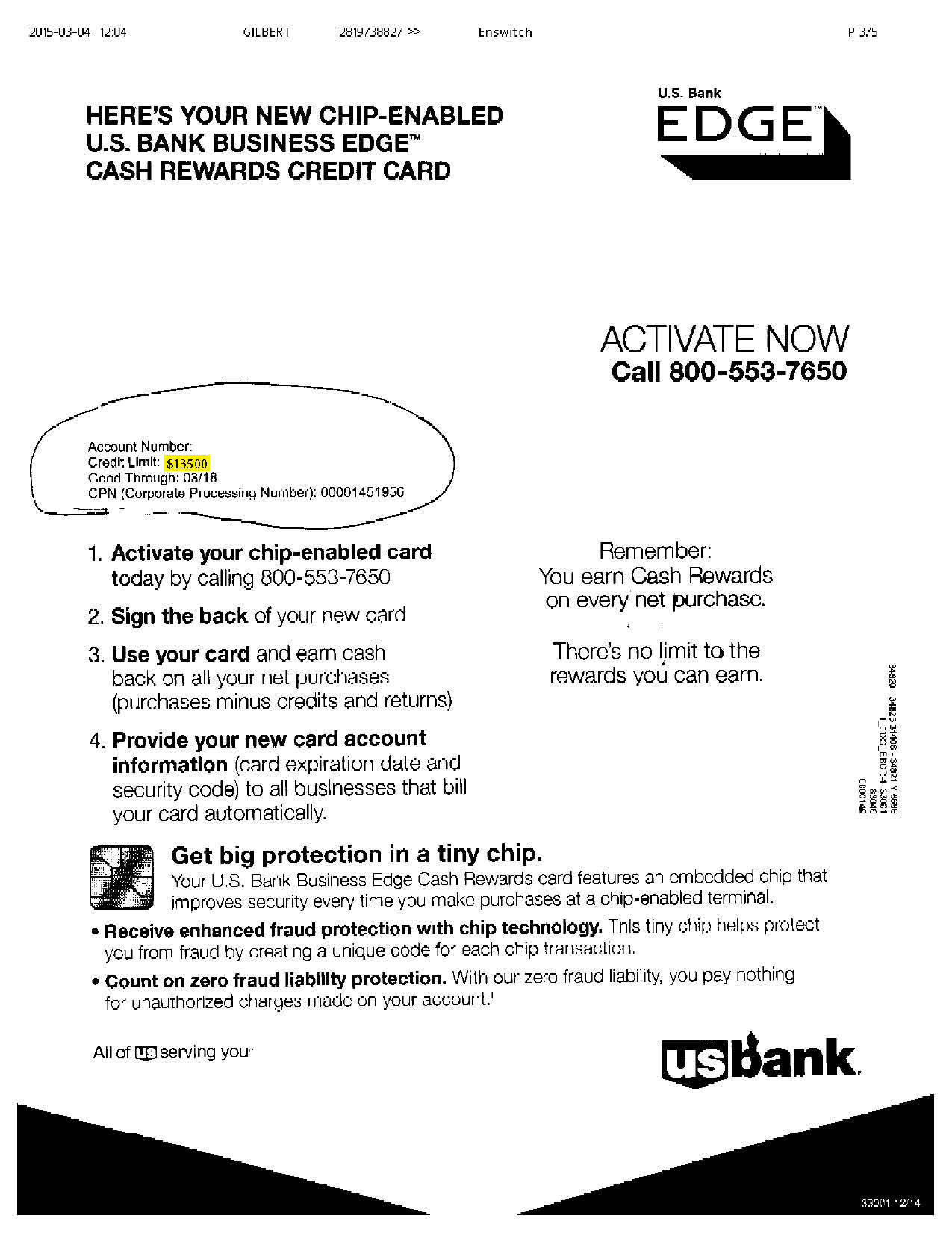 $13,500 U.S. BANK APPROVAL