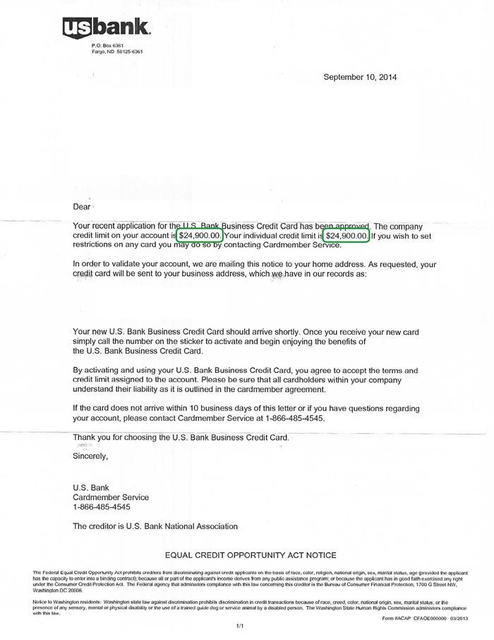 $15,000 U.S. BANK APPROVAL