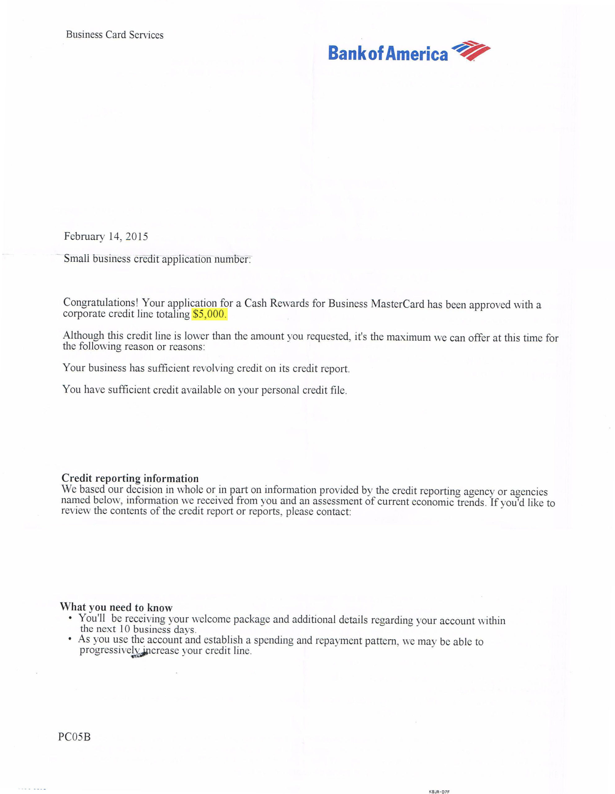 $10,000 BANK OF AMERICA APPROVAL Approval