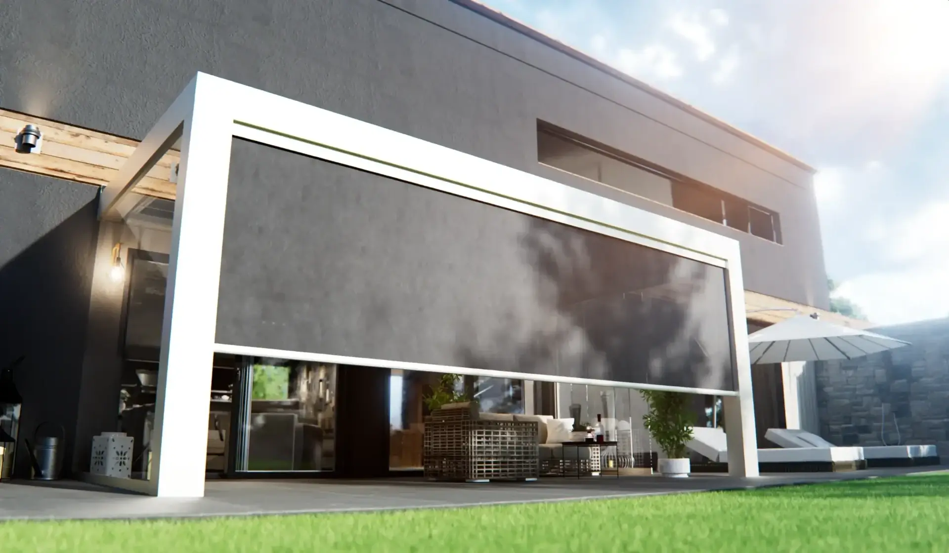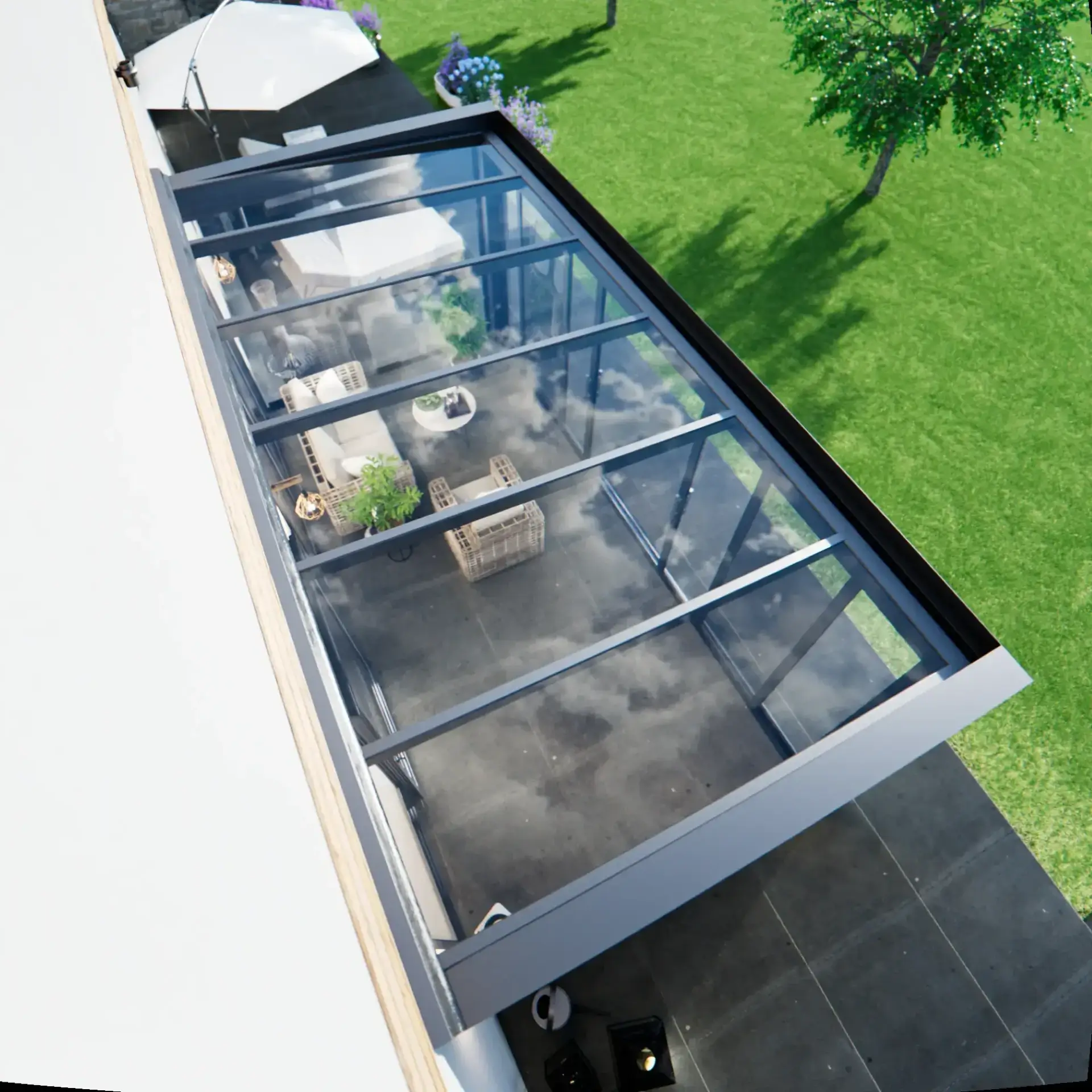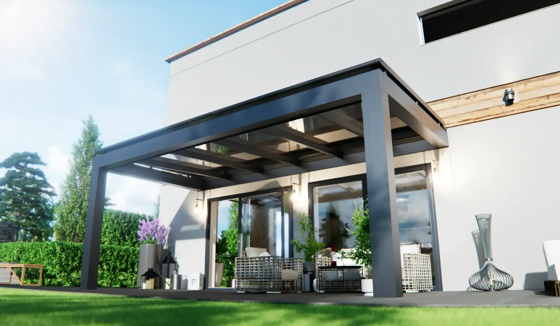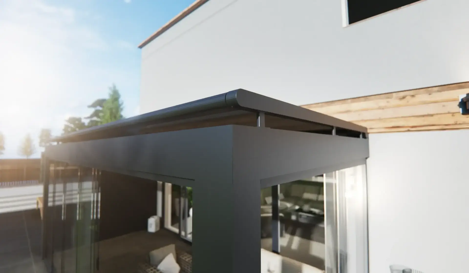 Le revêtement en poudre de 80 micromètres offre non seulement un aspect contemporain et lisse, mais procure également une excellente résistance aux conditions météorologiques rigoureuses. Les colonnes carrées, mesurant 200 x 250 millimètres, forment une structure solide et stable. Le système comprend une gouttière de 203 millimètres de large et des poutres mesurant 55 x 122 millimètres.