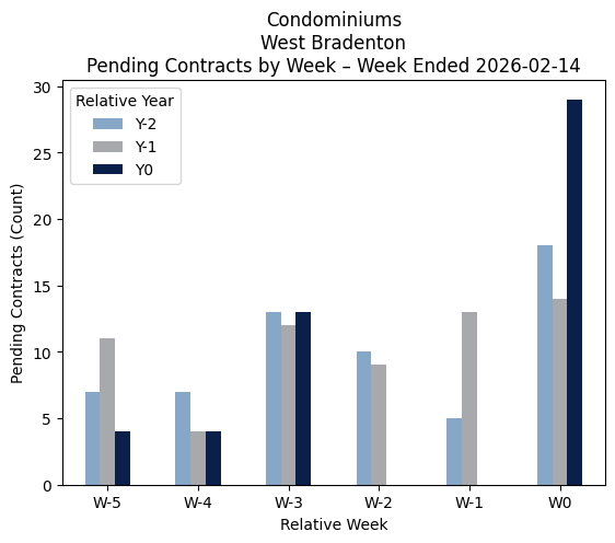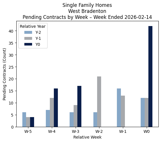 Source of data is Stellar MLS for the property types Condominiums (Condominiums and Townhouses) and Single Family Homes (Single Family Homes + Villas) in ZIP 34209, 34210, 34215 (excluding new construction) over the past 6 weeks ended 02-14-2026 and the same comparable period in 2025 and 2024. Pendings are homes listed for sale that have been placed under contract. The current number of new pendings is one of the best measures of current market activity. The graphs show that activity for each of the past 6 weeks vs comparable weeks in the prior 2 years.