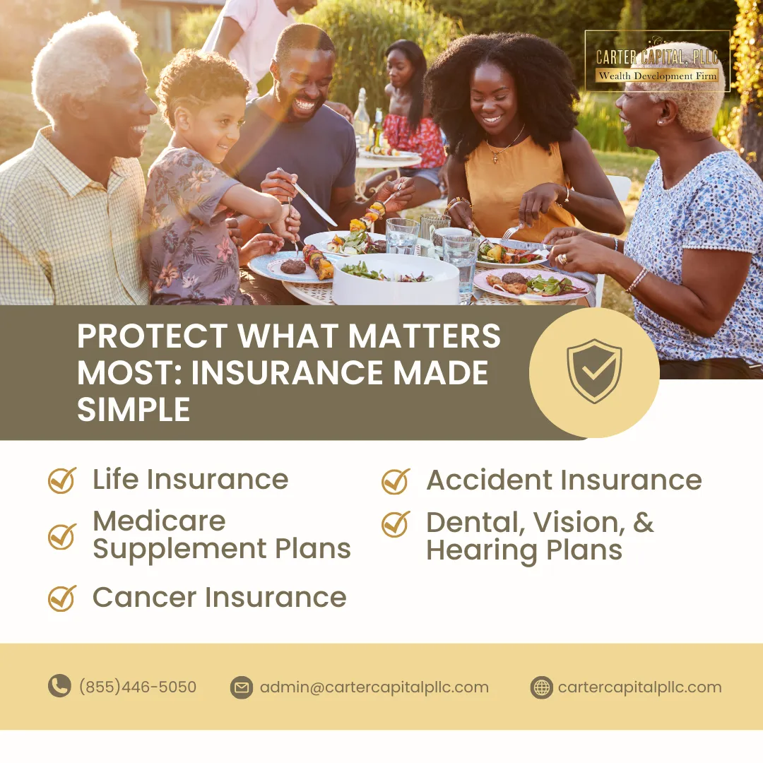 At CARTER CAPITAL PLLC, we're a premier life insurance agency built on a foundation of care and dedication. Our network of independent agents is committed to providing personalized financial protection solutions that bring peace of mind and hope for a brighter future. With years of combined industry experience, our agents are dedicated to understanding your unique needs and goals, tailoring their expertise to help you safeguard your loved ones and achieve your long-term aspirations. As independent agents, they offer unbiased guidance and a wide range of comprehensive life insurance products to ensure your family's well-being and financial security. Let us help you protect what matters most, every step of the way.
