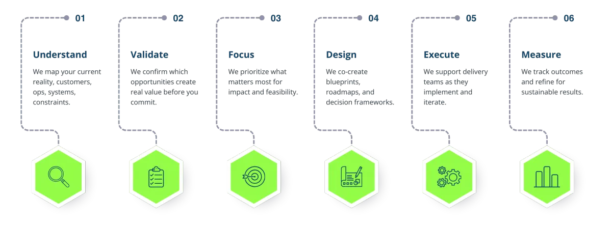 We bring structure, evidence, and practicality to transformation. No vague innovation theater, just real decisions and measurable change.