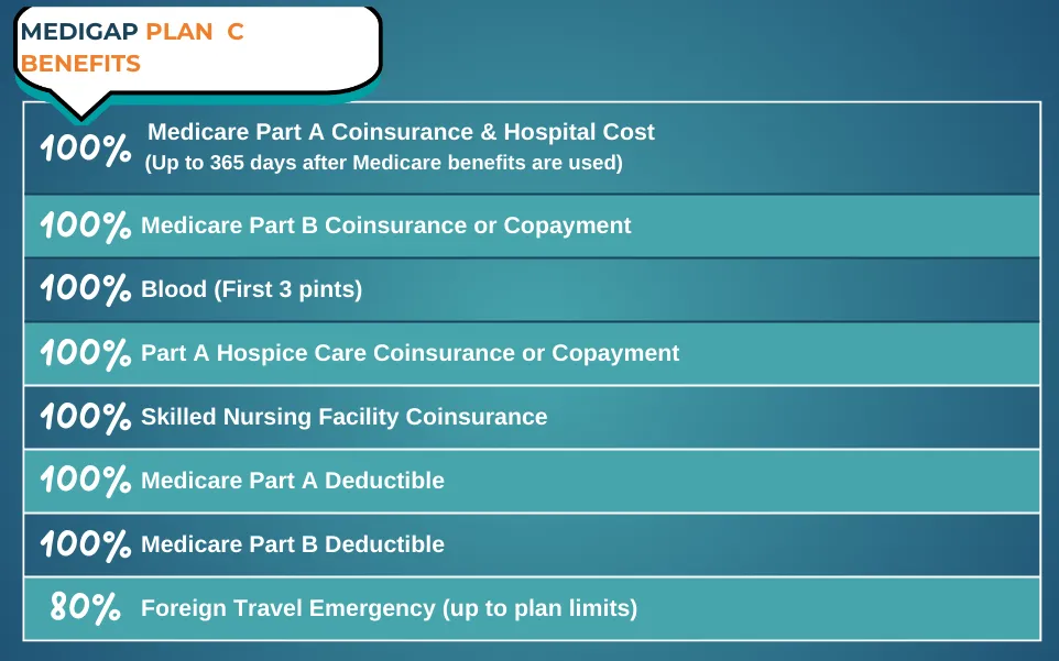 Medigap Plan C covers almost all costs except Part B excess charges. If you live in a state that bans these charges, this won’t matter. It also provides first-dollar coverage, meaning no deductible is needed.