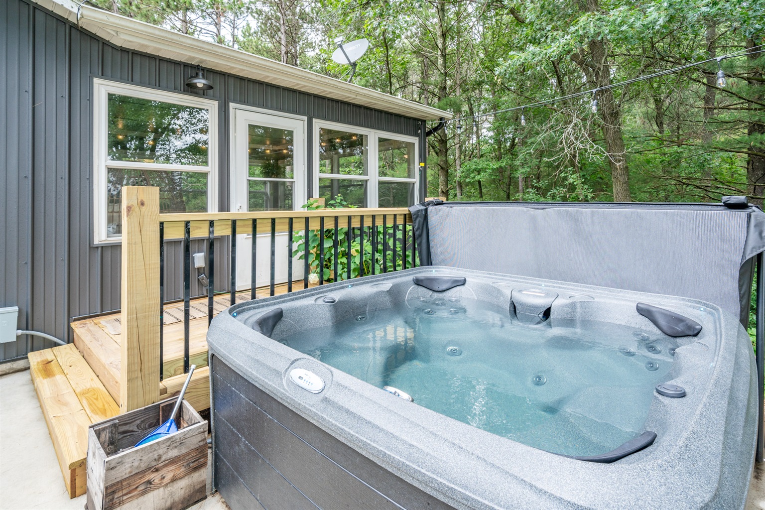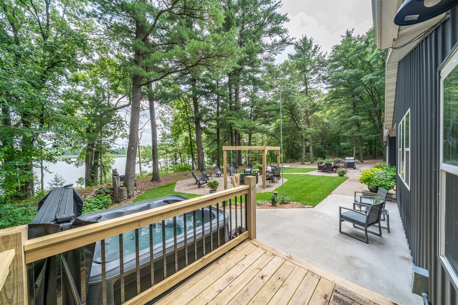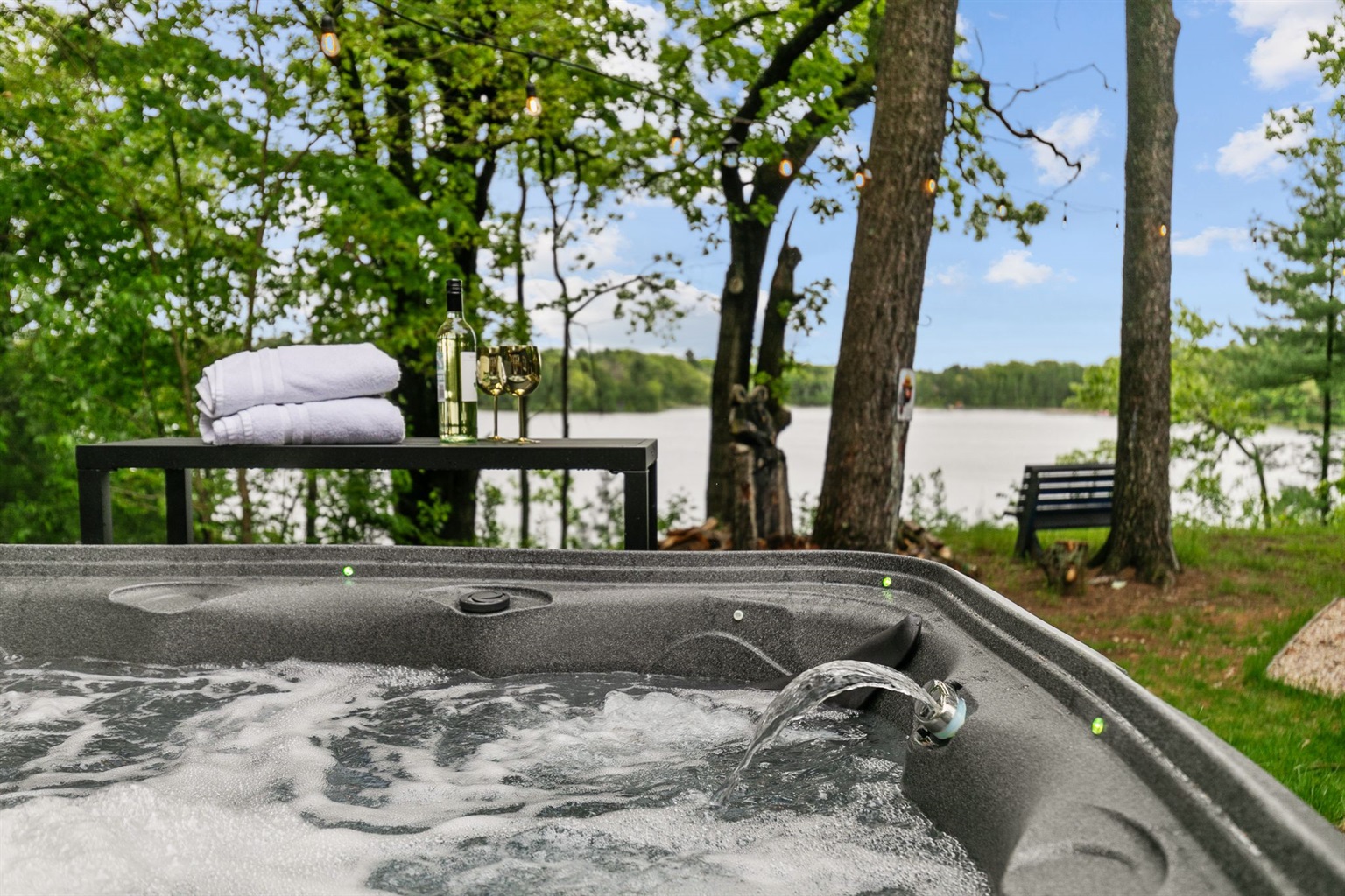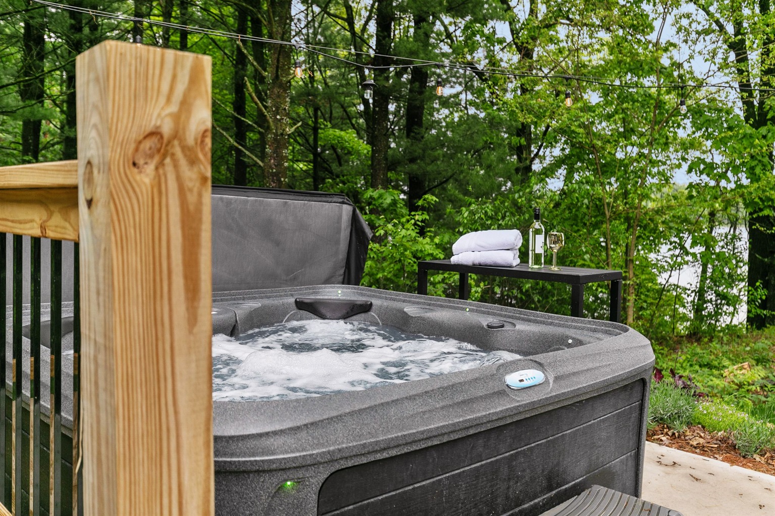 Lakeside Relaxation: Hot tub overlooking the water and floating swim raft.