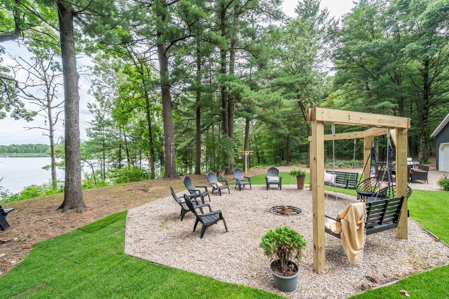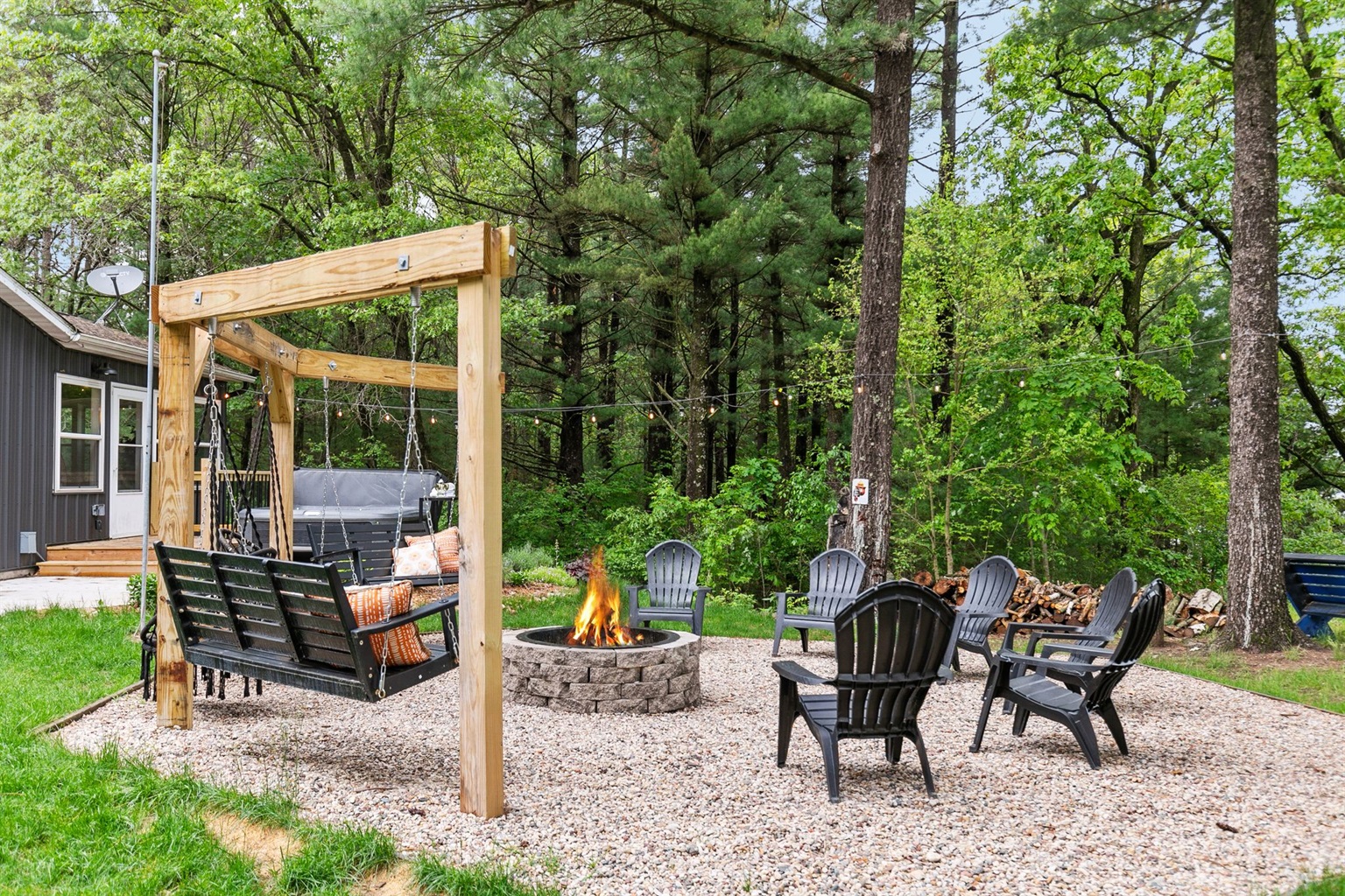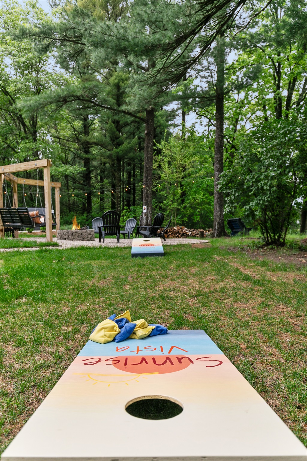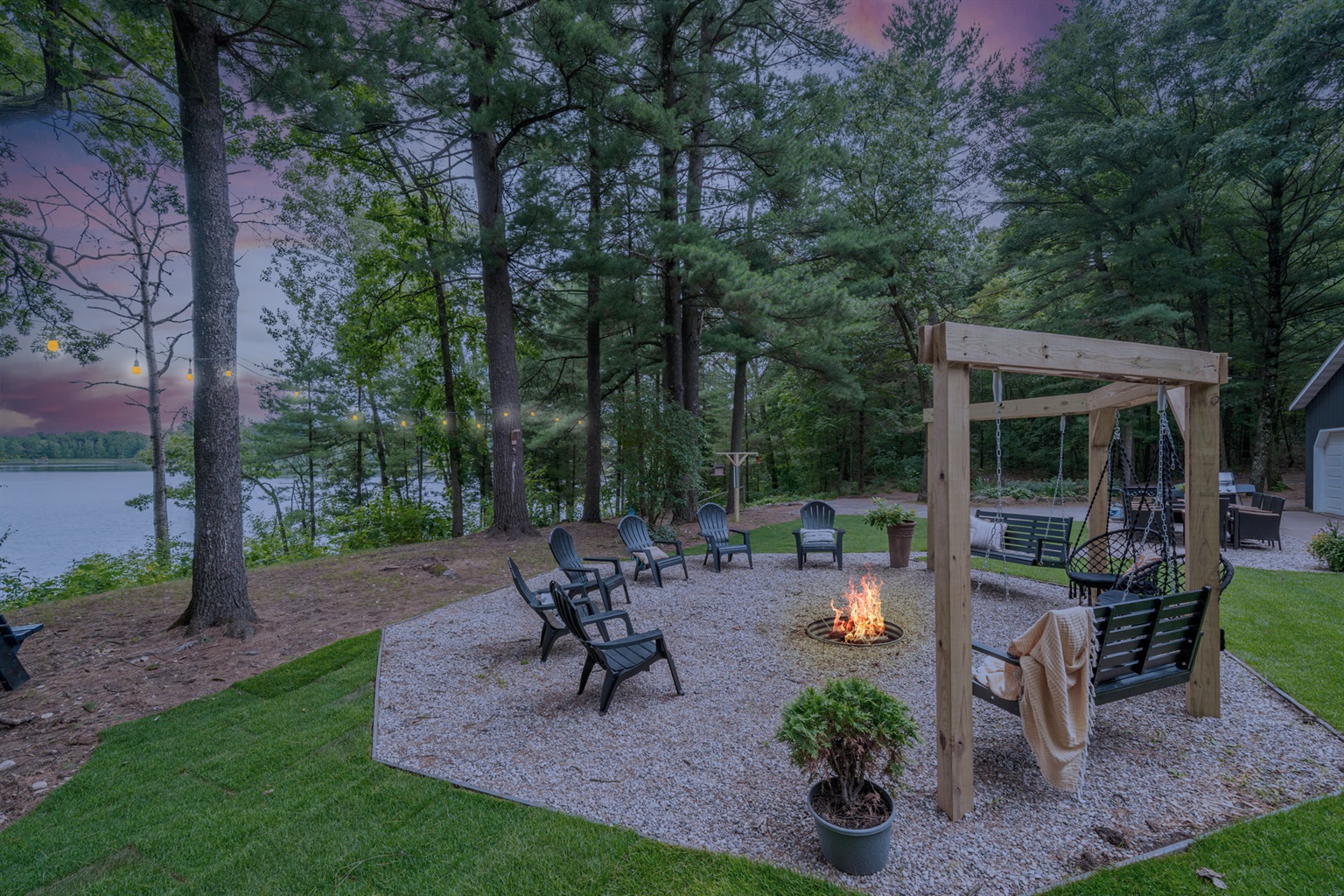 Evening Gathering: Fire pit with Adirondack seating and hillside swings.