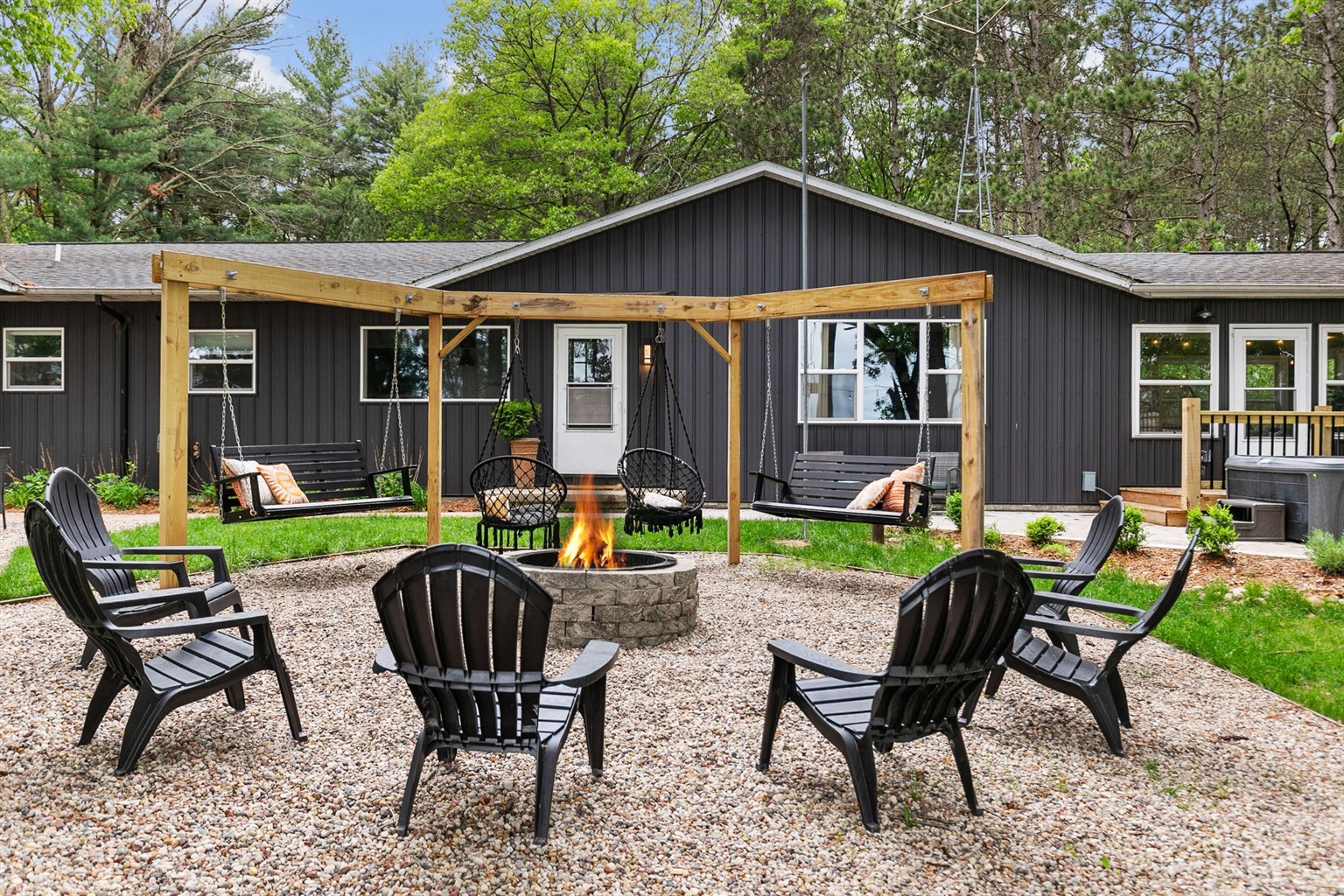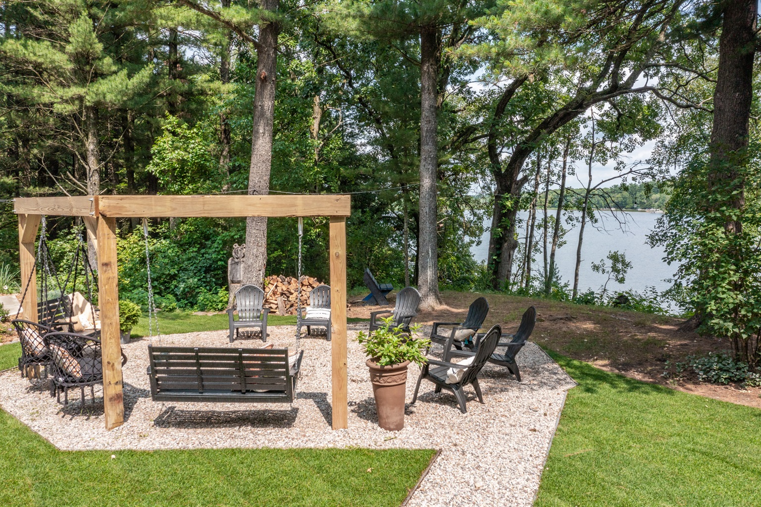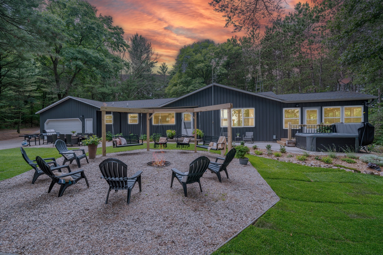 Evening Gathering: Fire pit with Adirondack seating and hillside swings.
