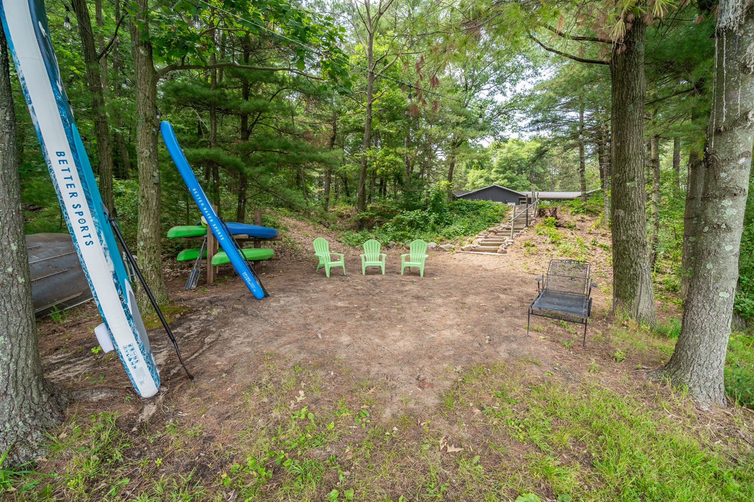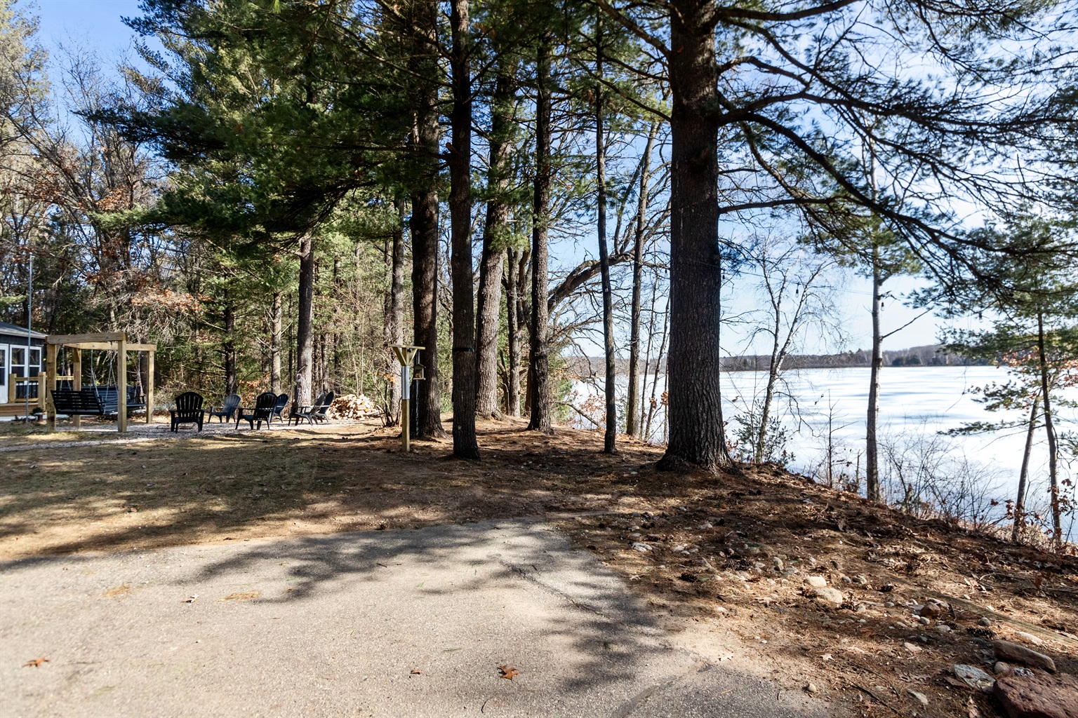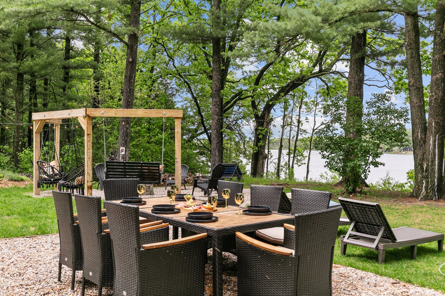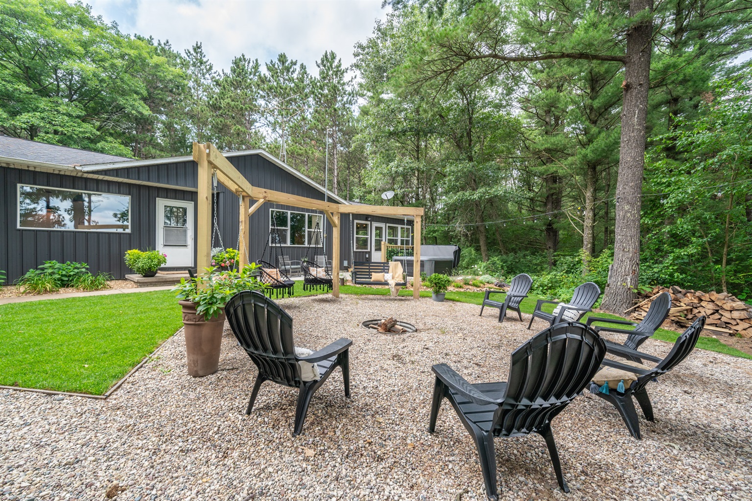 Evening Gathering: Fire pit with Adirondack seating and hillside swings.