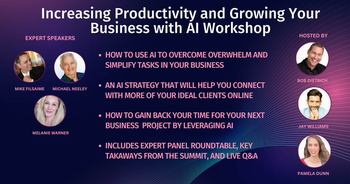 #4. LIVE Private "Increasing Productivity & Growing Your Business with AI Workshop" includes AI Expert Panel Roundtable with Q&A and Key Takeaways from the summit, with Mike Filsaime, Melanie Warner, Jaclyn Taylor, and Michael Neeley, Includes Lifetime Access ($197 Value)