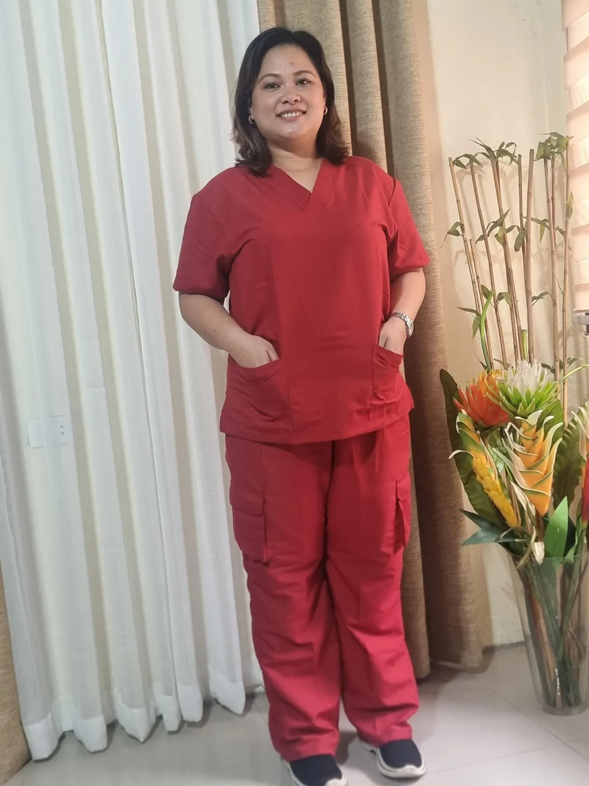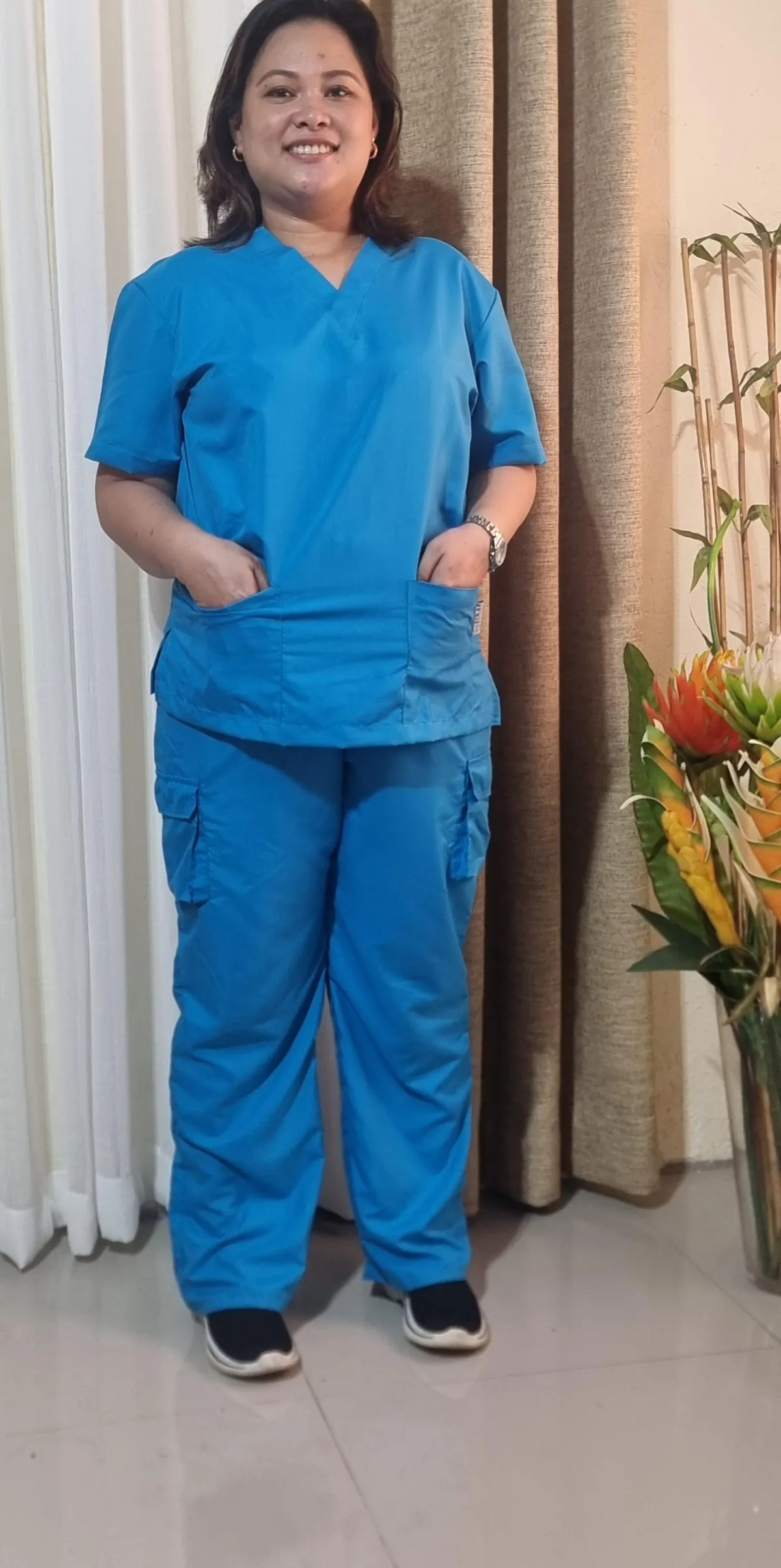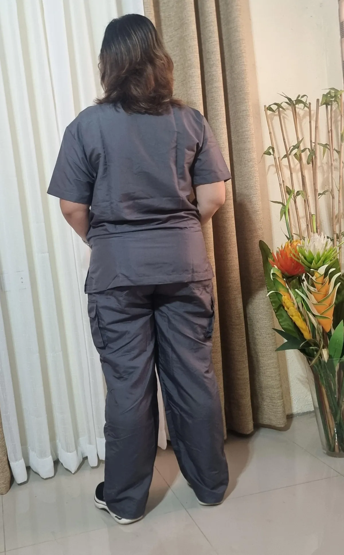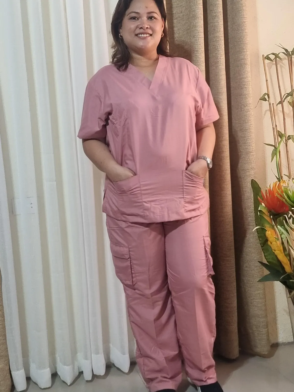 ✓ Figure-Flattering: v neck blouse with 2 deep pockets. Pants have 2 back pockets and roomy cargo pockets on each side of the thighs.