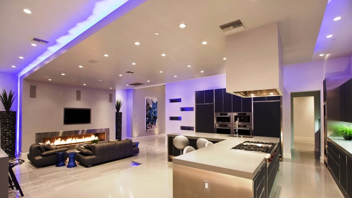 Indoor and outdoor lighting installations including smart lighting setups.