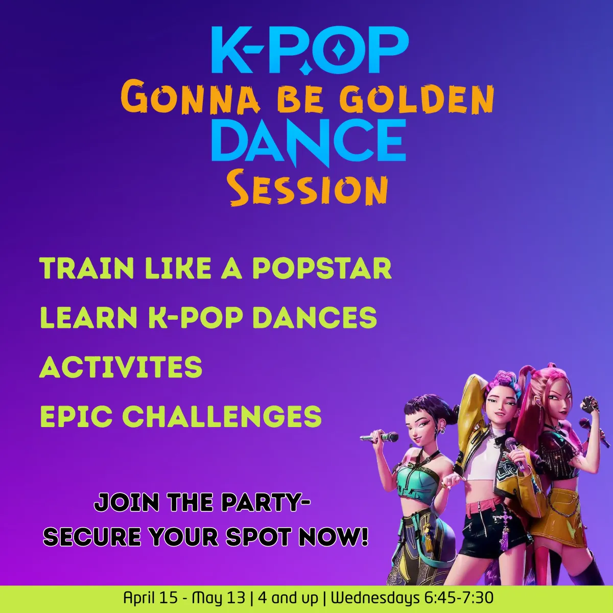 Gonna Be Gold is a 5-week spring mini session designed just for K-Pop Lovers ages 4 and up. Dancers will train like popstars, learn fun K-Pop Dances, engage in fun activities, and tackle epic challenges!